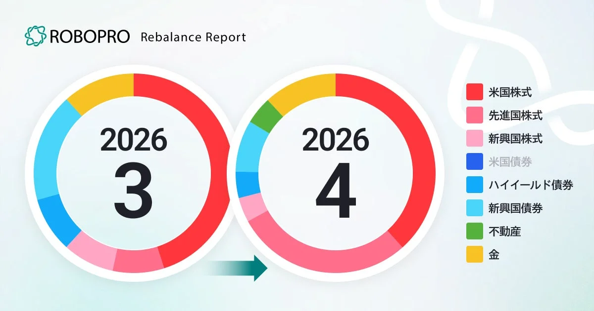 SBIグループの株式会社FOLIOは、2026年3月27日にAI投資「ROBOPRO」の投資配分変更を実施しました。原則月一回行われるこの変更では、新たに不動産がわずかに組み入れられ、米国株式、先進国株式、金、新興国債券、不動産、ハイイールド債券、新興国株式の7資産構成となりました。