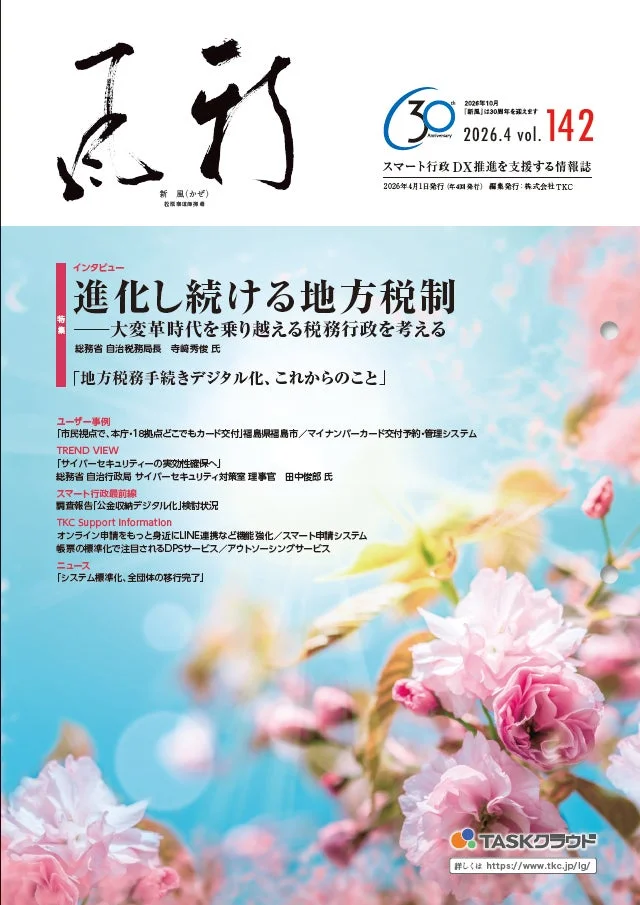 『新風』はA4判16ページで、季刊(1月、4月、7月、10月)で発行されています。全国の地方公共団体のほか、中央省庁や関係機関へ無償で配付されます。最新号とバックナンバーは、TKCのウェブサイトからも閲覧可能です。