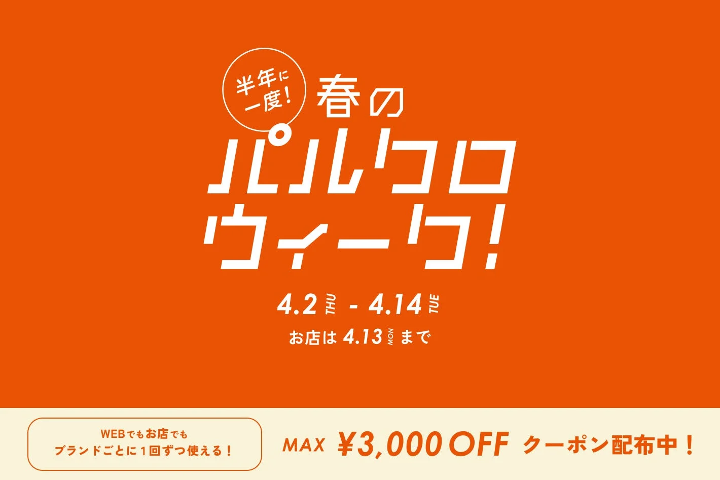 期間中、パルグループの店舗とパルクローゼットでブランドごとに1回ずつ利用できる、最大3,000円OFFクーポンが配布されます。クーポンの利用条件はブランドによって異なるため、各ブランドページでの確認が推奨されています。