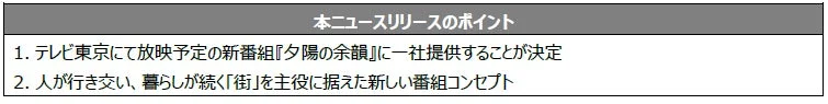 ナレーターを務める稲垣吾郎氏からは、「見慣れた景色も、視点や気持ちを変えるだけで新しい景色に見えてくるのでいろいろな夕陽の表情を見られるのは、番組として素敵ですよね。シリーズを通して、いろんな街をフィーチャーしていくのがこれからも楽しみです。この番組の余韻に、そして僕の声の余韻に浸っていただけたらと思います。」というコメントが寄せられています。