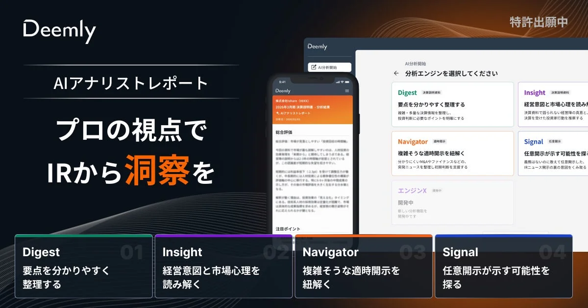 Deemlyは、決算説明資料や適時開示といった一次情報をもとに、投資判断に必要な洞察をアナリストレポートとして生成・出力するAI分析エンジンです。