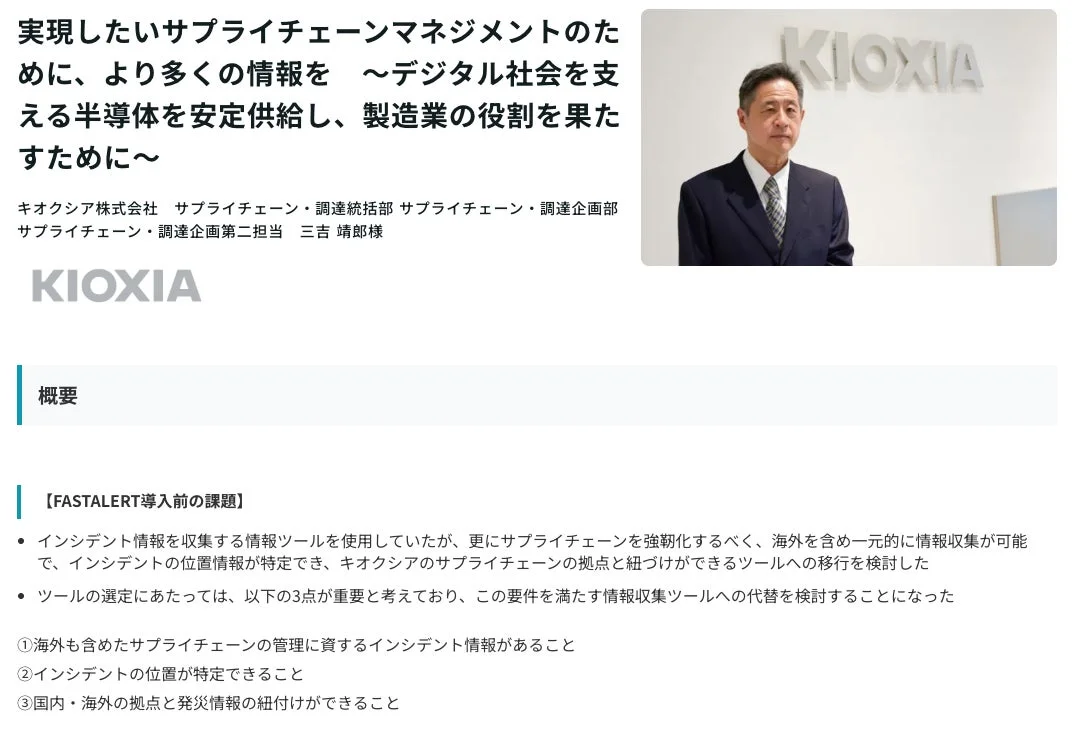 導入後は、インシデント発生時の影響調査における初動の情報源として活用されています。さらに、発災マップを用いた視覚的な情報共有により、社内関係部署への状況説明が円滑になるなど、当初の想定を超えた活用も進んでいます。キオクシアは今後も「FASTALERT」の活用を通じて、製造業としての社会的責任である製品の安定供給を支える、サプライチェーンの強靱化を進める方針です。