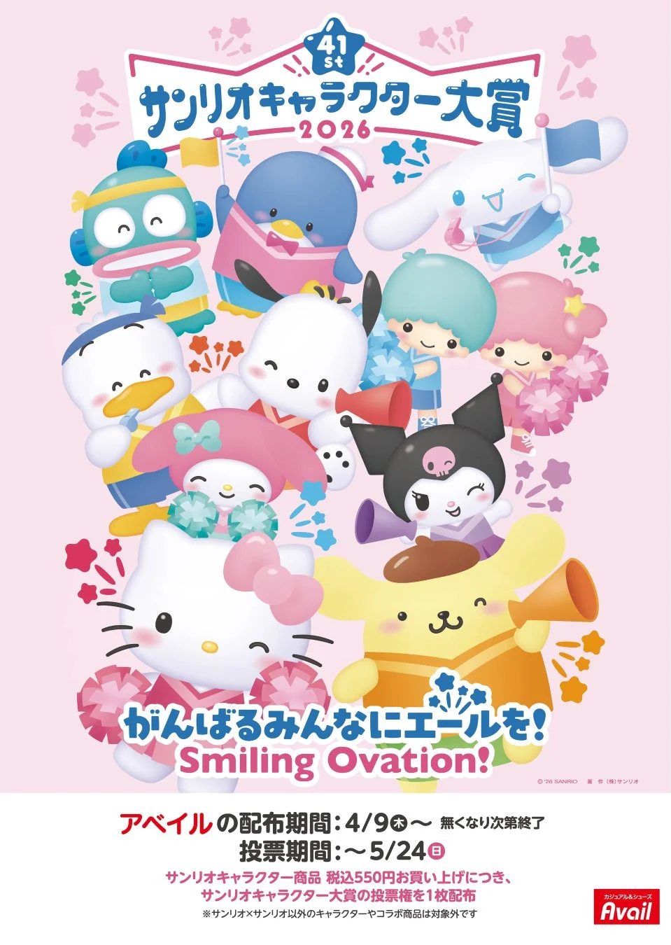 4月9日(木)より、アベイルの各店舗でサンリオキャラクター商品を購入すると、550円(税込)ごとに投票券が1枚もらえます。配布期間は投票券がなくなり次第終了となるので、早めにチェックするのがおすすめです。投票期間は5月24日(日)までとなっています。