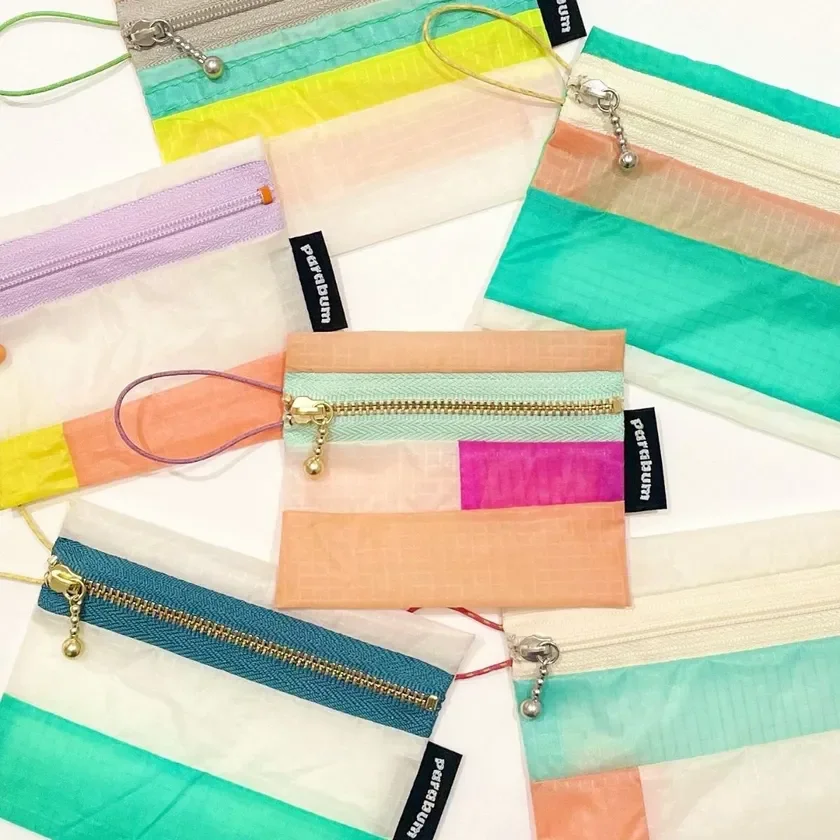 「parabum」は、S・M・Lサイズに加え、ペンケースも展開されています。特に人気のSサイズは、コインケースやイヤホン、鍵などの小物収納として活用されており、紛失しやすいものをまとめて持ち歩けると好評です。