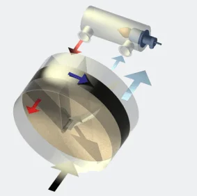 装置は吸着剤を担持したローターを連続回転させる構造を持ち、吸着・脱着・冷却工程を一体的に実行することでVOC濃縮を効率化します。これにより、後段の熱酸化処理(RTO)や回収システムにおける処理負荷が大幅に低減され、エネルギー消費と運用コストの抑制に貢献します。