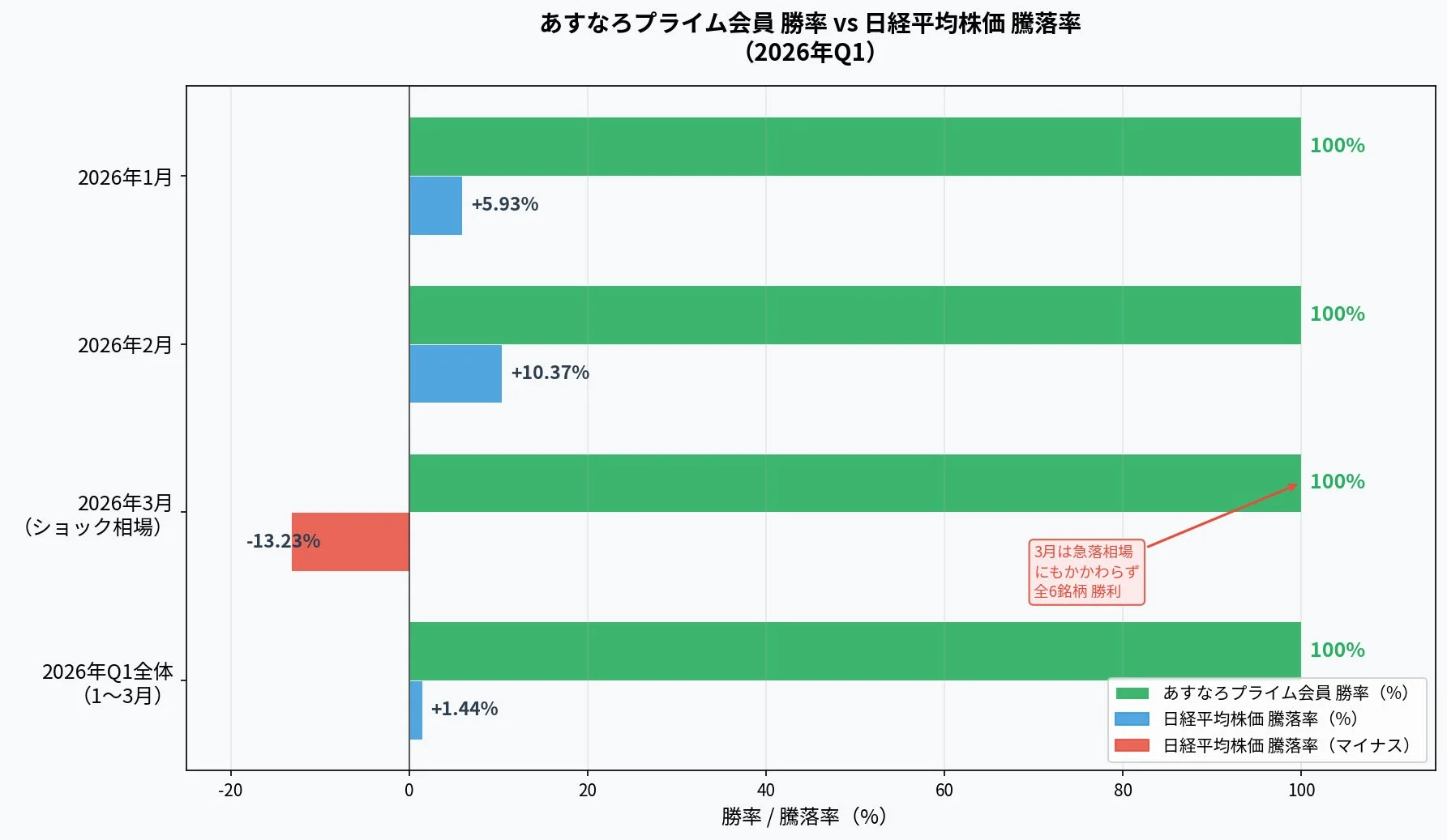 株式会社あすなろが提供する売買助言サービス「あすなろプライム会員」は、2026年第1四半期(1月〜3月)に推奨した限定大型株全12銘柄において、目標達成または利益確定の提言を行い、勝率100%を達成したことを公表しました。この期間は日経平均株価が急落する局面に見舞われましたが、市場の変動に左右されない成果を記録しています。