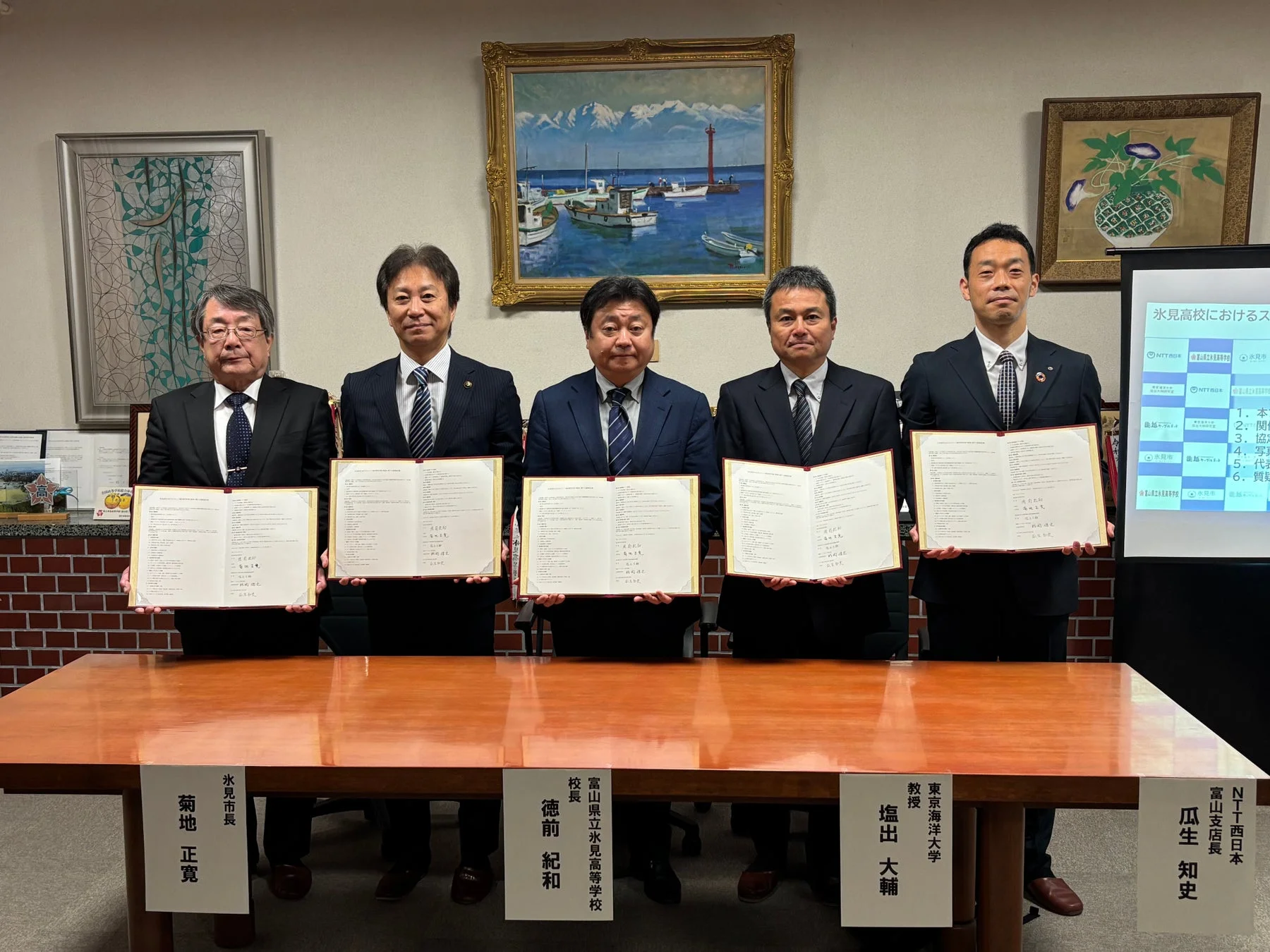 2026年4月16日、富山県立氷見高等学校(以下、氷見高校)、氷見市、国立大学法人東京海洋大学学術研究院海洋生物資源学部門塩出大輔教授(以下、東京海洋大学)、能越ケーブルネット株式会社、NTT西日本株式会社富山支店(以下、NTT西日本)の5者は、「氷見高校におけるスマート海洋探究学習の推進に関する連携協定」を締結しました。この協定は、氷見高校海洋科学科の教育充実と地域の海洋産業の高度化を目的としています。
