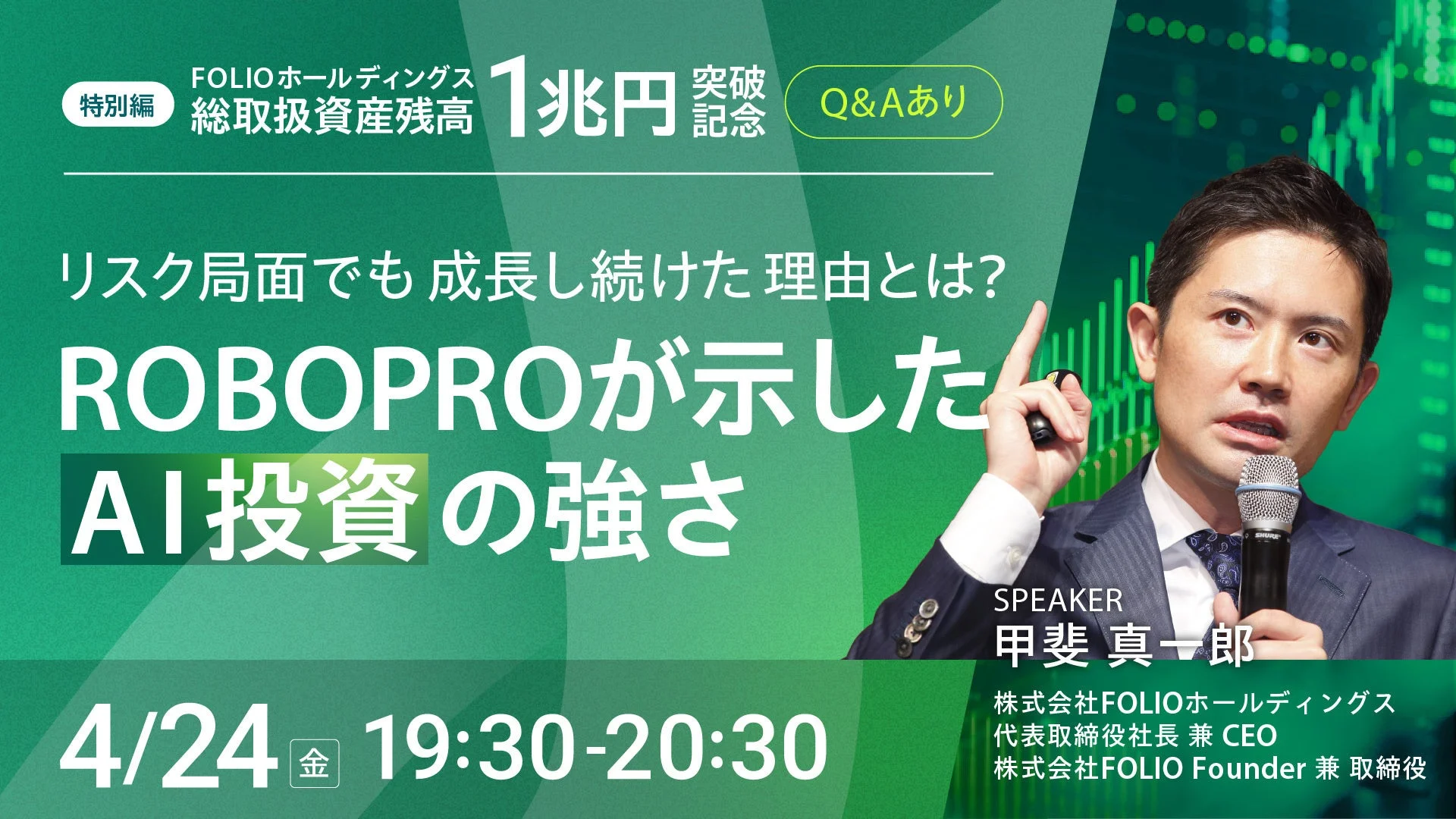 本セミナーでは、株式会社FOLIOのFounder 兼 取締役である甲斐 真一郎氏が登壇します。FOLIOの創業から10年の歩み、ROBOPROの運用戦略とその広がり、そして2026年の相場展開におけるROBOPROの実績について語られます。