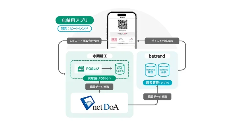 『netDoA』で本部一括管理された商品マスターと、『betrend』の会員証が連携します。レジでのオペレーション負荷を増やすことなくポイント付与やデータ蓄積を完結できるほか、店舗ごとのマスター管理の手間を削減し、スタッフが接客や店舗運営に注力できる環境作りを支援します。