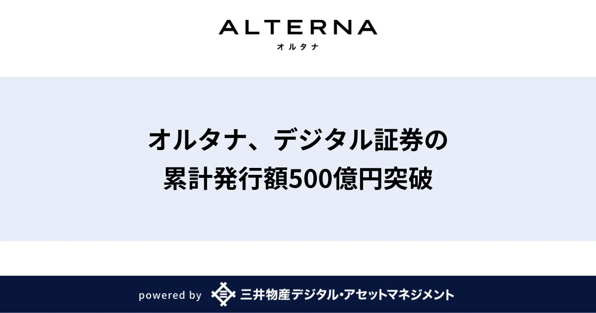 三井物産デジタル・アセットマネジメント株式会社が提供するオルタナティブ投資サービス「ALTERNA(オルタナ)」において、デジタル証券(セキュリティ・トークン)の累計発行額が500億円を突破しました。また、同社以外の証券会社経由の分も合わせると、累計発行額は750億円を超えています。