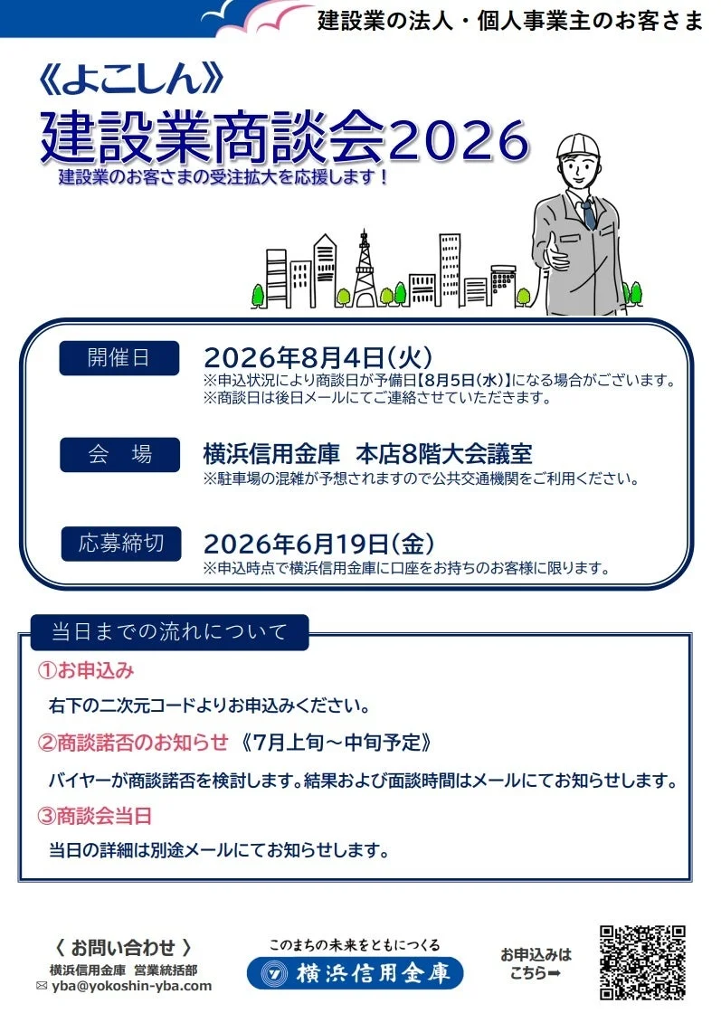 横浜信用金庫は、地域経済の活性化と取引先の受注拡大を支援するため、「建設業商談会2026」を2026年8月4日に開催します。この商談会は、建設業界の法人・個人事業主を対象に、新たなビジネスチャンスの創出を目的としています。