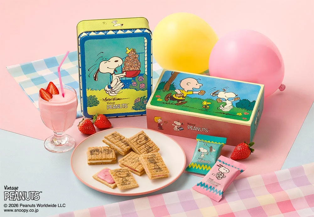 スヌーピー、チャーリー・ブラウン、サリー、ライナスが飛び出すポップアップ付きのスペシャルボックスに、定番の『スヌーピー シュガーバターサンドの木』と春夏限定『ストロベリーシェイク風』の2種類が詰合せになっています。価格は1,857円(本体価格1,720円)です。